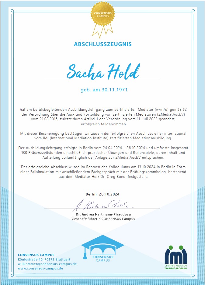 Meine Akkreditierung als zertifizierter Mediator IMI (International Mediation Institute) wurde im Oktober 2024 verliehen, nach Abschluss eines intensiven Ausbildungsprogramms und einer fundierten Prüfung.