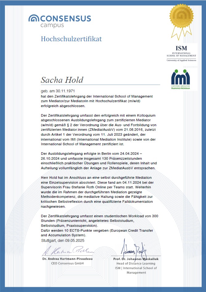 Im Mai 2025 wurde meine Mediationspraxis durch eine Supervision bestätigt, wodurch ich die Akkredetierung als zertifizierter Mediator ISM (International School of Management) erhalten habe.